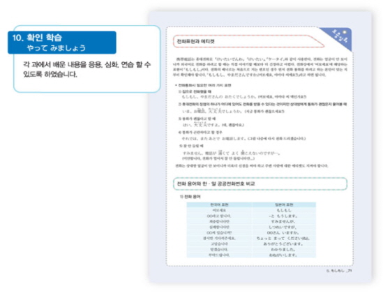추가적으로 본문의 주요 문형 및 문화적 내용 등에 해설을 덧붙여 이해를 도왔습니다. 해당 단원의 내용을 기반으로 하여 일본인의 언어행동문화를 엿보고, 관련 정보를 습득할 수 있도록 보충심화 코너를 새로이 마련하여, 미처 다루지 못한 주요 문법, 단어, 문화 등의 내용을 익히며 단원의 내용을 짚고 넘어갈 수 있도록 하였습니다.