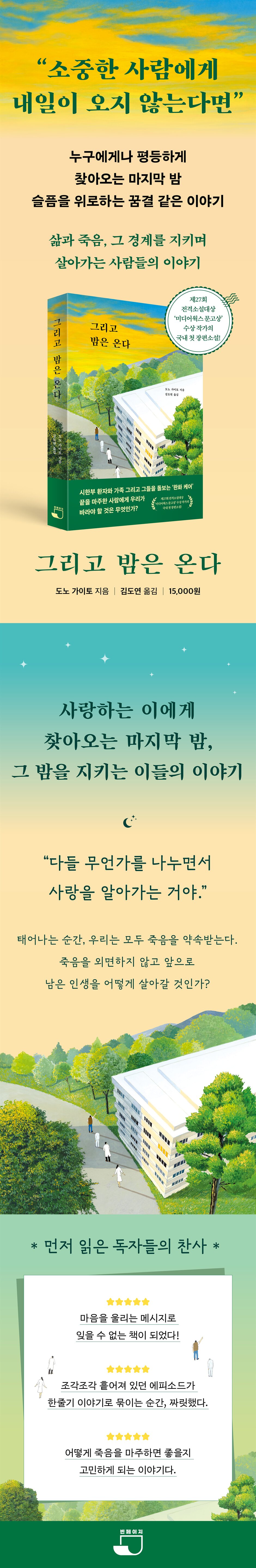 이처럼 고요한 일상을 유지하던 병동에서 어느 날 유령에 대한 소문이 들리기 시작하고, 소설은 뜻밖의 전개로 예상치 못한 흥미를 불러일으킨다. 이야기의 처음과 끝을 섬세하게 구성한 저자의 예리한 연출력이 돋보이는 것도 이 소설의 매력이다. 묵직한 울림과 소설적 재미를 동시에 잡은《그리고 밤은 온다》는 독자들에게 도노 가이토라는 이름을 선명히 새겨줄 것이다.