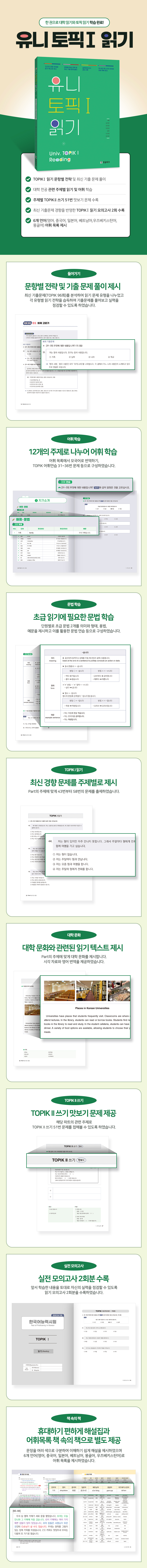 이 책은 외국인 유학생 학습자들의 요구를 충족시키기 위하여 TOPIK 2급 취득과 대학 생활 적응이라는 두 가지 목표를 함께 달성할 수 있도록 구성되었습니다. <유니 TOPIK Ⅰ 읽기>는 유학생들이 대학 생활에 적응할 수 있도록 기본적인 주제를 중심으로 12단원으로 구성하였습니다. 먼저 단원의 주제와 관련된 어휘와 문법을 제시하고 관련 문제를 풀어보도록 하였습니다. 이어서 실제 시험에서 출제되느 TOPIK Ⅰ의 다양한 읽기 유형 문제를 풀어보며 시험 감각을 기를 수 있게 하였습니다. 또한 단원 주제와 연결된 대학 생활 관련 문화를 읽기 자료로 제시하여 배경지식을 넓히고 대학 문화를 이해하게 하였습니다. 마지막으로 TOPIK Ⅱ 쓰기 51번 문제를 연습해 보면서 초급 단계를 넘어 중급 쓰기에 도전해 보도록 하였습니다.