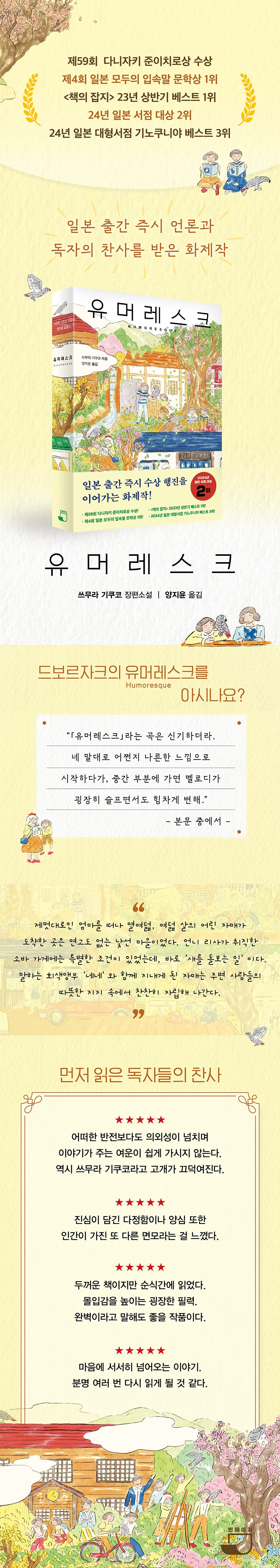 다자이 오사무상, 아쿠타가와상, 노마문예 신인상, 가와바타 야스나리 문학상, 예술선장 신인상 등 일본 문학계의 주요 문학상을 수상한 작가 쓰무라 기쿠코의 신작 장편소설 《유머레스크》가 출간되었다. 평범한 현대인들의 일상을 섬세하게 포착하는 작품으로 주목받아온 작가는 이번 소설에서도 그 문학적 역량을 유감없이 발휘했다. 《유머레스크》는 일본 출간 당시 화제를 모으며 독자들과 언론의 극찬을 받으며 다니자키 준이치로상을 수상했고 서점 상위권 랭크를 기록했다.